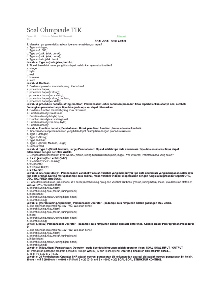 Soal osn tik. Kumpulan soal dan jawaban osk 2017 semua bidang jenjang sma kamis 16 maret 2017 berikut ini adalah alternatif pranala soal seleksi olimpiade sains tingkat kabupaten kota 2017 calon tim olimpiade indonesia 2018 semua bidang dan kunci jawaban semua bidang. 1 detiktestcase Batas Memori. Soal OSN TIK SMA Soal Olimpiade TIK SOAL-SOAL DEKLARASI 1.